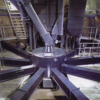均化庫(kù)庫(kù)頂布料一般選用圓柱形生料分配器,該分配器充氣室用兩層滌綸纖維作充氣材料,以中壓離心鼓風(fēng)機(jī)供氣。經(jīng)流態(tài)化的生料由生料分配器通過斜槽多點(diǎn)均勻入庫(kù)。